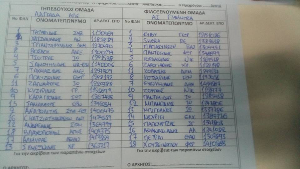 ΑΠΕ ΛΑΓΚΑΔΑ: Ταταρίδης, Χατζηλιάδης, Τριανταφυλλίδης, Τσότρας, Βόσδου, Σαμουηλίδης, Ταχμαζίδης (60΄ Βλαχόπουλος), Πολυζωίδης (82΄ Αλμύρας), Κυζιρίδης, Καραγκούνης (62΄ Συμεωνίδης), Ζαγναφέρης.